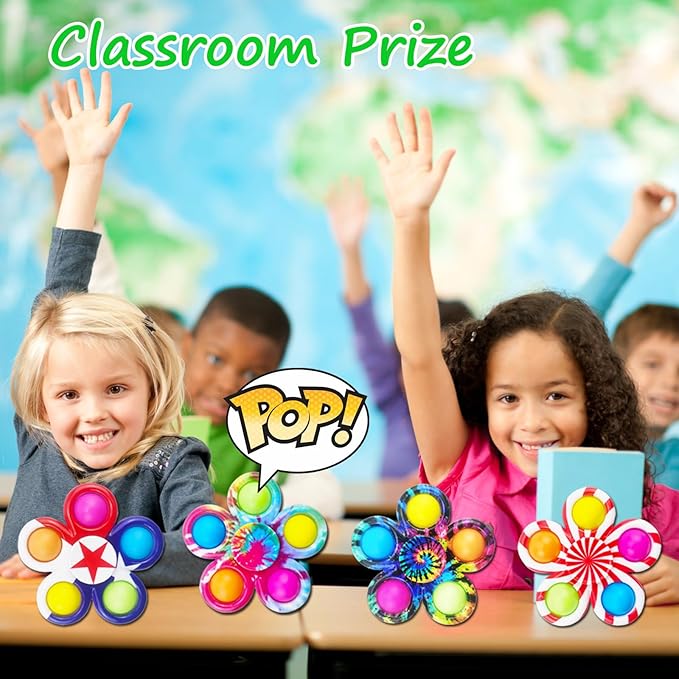 - 【2 in 1 Unique Design Fidget Spinner】It includes 5pack 2 in 1 pop fidget toys with 5 different kinds of vivid color patterns. It is not only a pop bubble toy, but also a fidget spinner. Pressing the bubble on any side will make a pleasant stress reliving "POP" sound.