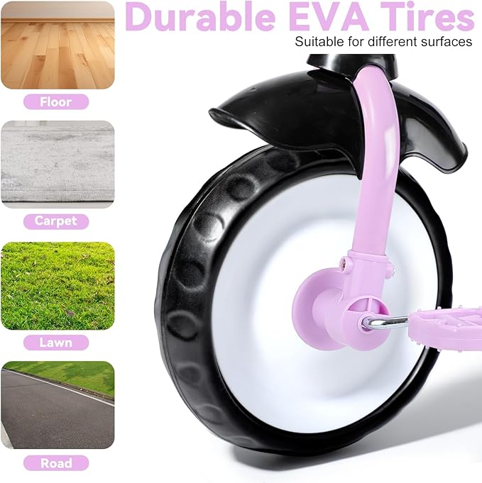 - Indoor & Outdoor Adventures: Blend indoor tranquility with outdoor exploration. This kids trike lightweight EVA tires ensure silent indoor rides that won't damage your floor. These wheels are also ready for the outdoors. Glide over grass or pavement, making each ride exciting