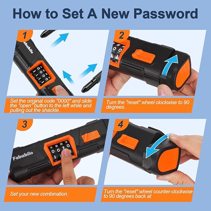 - 【Easy to Set & Use】The heavy duty bike u lock has a 4-digit resettable anti-theft combo, the numbers are easy to turn. Combination locking mechanism provide keyless convenience and set your own password by easy steps.When setting your new code, please first keep the digital wheel in the correct unlock password state before turning the reset disk. Turn the reset disk 90° to set a new password. The initial code is ”0000“. You can easily reset the combination. The combination lock is quite convenient and easy to work