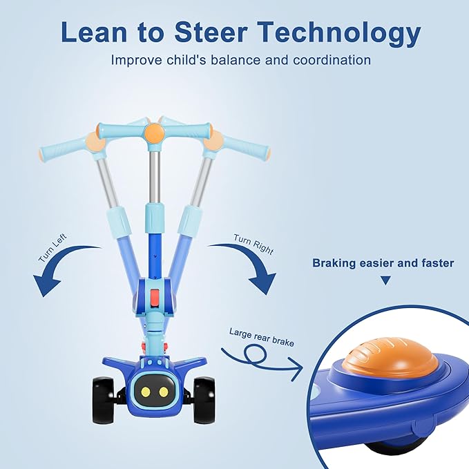 - Safe & Smooth Ride: Our scooter has lean-to-steer tech for kids to control turns by leaning, improving balance and coordination. Sturdy and widened PU wheels ensure stability and smooth riding for safe and fun.