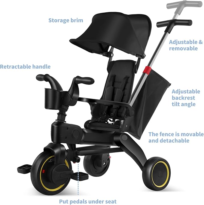 5-in-1 Compact, Foldable Tricycle - Suitable for Toddlers 10 to 36 Months Push Tricycle Bike for Toddlers with Removable Handle Seat Adjustable Canopy for Kids