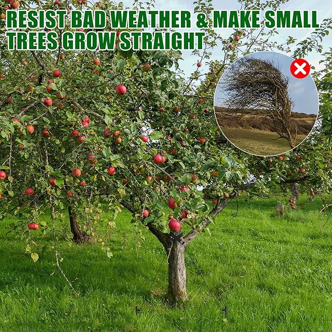 - Quality Material: the tree straightening kit is made of quality steel material, with black powder coating, corrosion and rust resistance, not easy to bend, which can withstand bad weathers, Wide nylon tree straps are better than ropes or wire ties and can be applied directly on the tree without worrying about friction or limiting growth; The soft, rounded edges of this rope will not cut or hurt bark