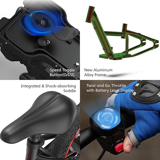 - Ergonomic and Safe: Equipped with anti-slip silicone handlebars, a vacuum-formed integrated shock-absorbing seat, rear disc brakes, and a user-friendly twist throttle with a battery indicator. These features ensure a comfortable and secure ride