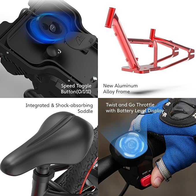 - Ergonomic and Safe: Equipped with anti-slip silicone handlebars, a vacuum-formed integrated shock-absorbing seat, rear disc brakes, and a user-friendly twist throttle with a battery indicator. These features ensure a comfortable and secure ride.
