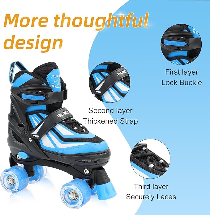 - ADJUSTABLE SIZE: PAPAISON roller skates adapt to growth and will meet the changing needs of boys' and girls' feet, extend the use time of roller skates, so you do not have to frequently replace different sizes of roller skates. It also improves fit, adjusting to the shape of different children's feet, making the skates fit more closely to the feet, improving comfort and stability.