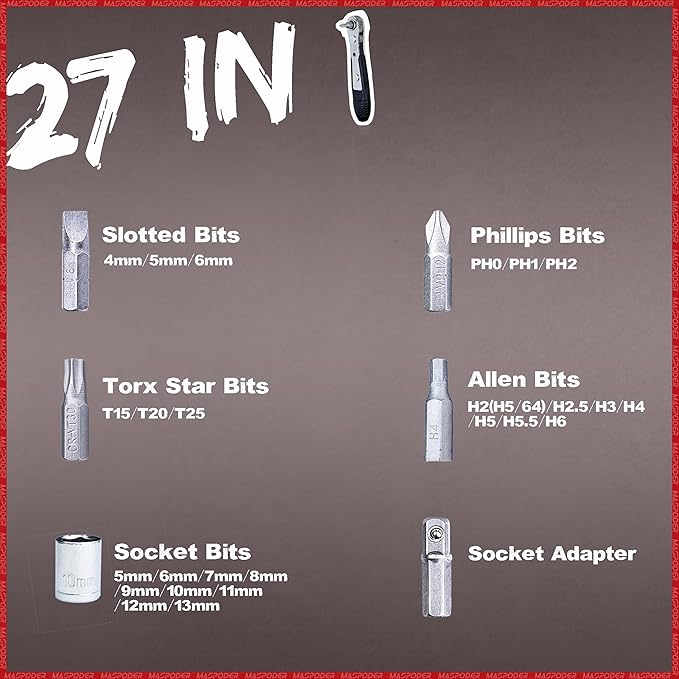 - Farewell to Bulky Toolboxes! The ratchet wrench in this driver bits set is crafted from high-strength carbon steel, and the drill bits are forged from chromium-vanadium steel. The 27-in-1 mini bike multitool packs various bits. The screwdriver measures 4.3 inches, compact enough to slip into your bike bag effortlessly. Having this on your bike journey is like having a portable toolbox, ready for more unexpected situations. It lets you enjoy your ride with ease!