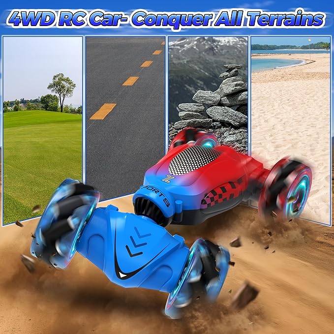 - Remote Control Car for Broad Age: The remote control car is a 4WD gesture sensing rc stunt car that not only provides interactive entertainment for a broad age range, from 4-7 to 8-12 years old but also improves hand-eye coordination