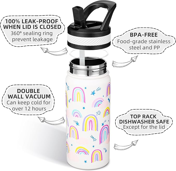 Fanhaw 18 Oz Kids Insulated Water Bottle with Straw - Stainless Steel Double Wall Vacuum Cup, Leakproof, BPA Free, Suitable for Boys and Girls(White - Rainbow Dream)