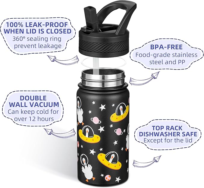 Fanhaw 14 Oz Kids Insulated Water Bottle with Straw - Stainless Steel Double Wall Vacuum Cup, Leakproof, BPA Free, Suitable for Boys and Girls(Black - Duck in Space)