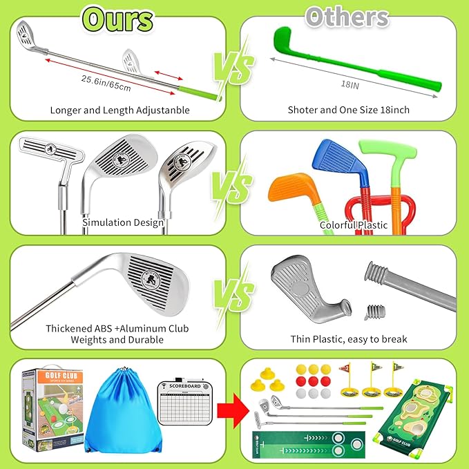 - Adjustable Kids Golf Clubs: Golf set for toddlers 1-3, golf set for toddlers 3-5 is ergonomically designed for toddlers, Each toddler golf clubs features length adjustable function, ensuring a custom fit for kids aged 2-8. Boosting their play experience with adjustable toddler golf club, providing a safe and engaging introduction to the game