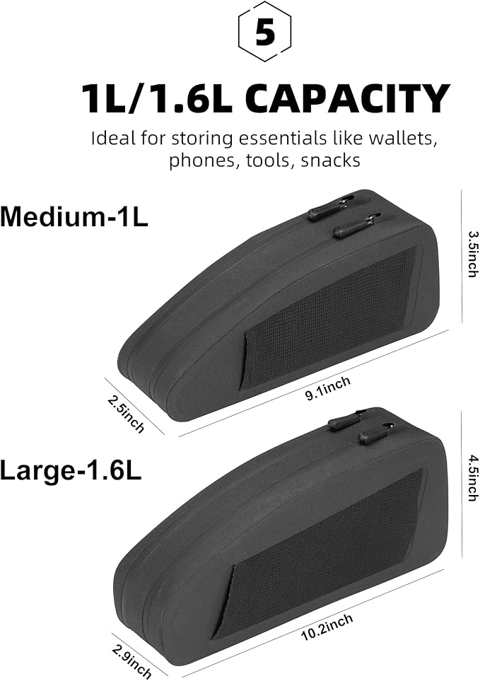 - LARGE CAPACITY: The top tube bags come in two sizes: Large (1.6L) and Medium (1L). They are suitable space to store essential items such as wallets, mobile phones, gloves, repair tools, snacks, energy gels, inner tubes, and power banks,please choose the size according to your needs.
