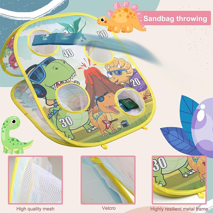 - 🎯 Triple the Fun: Enjoy three different game modes with our versatile set! Play the classic sandbag throw, test your skills with ball toss to the dartboard, or challenge friends to a fast-paced sandbag tic-tac-toe game.