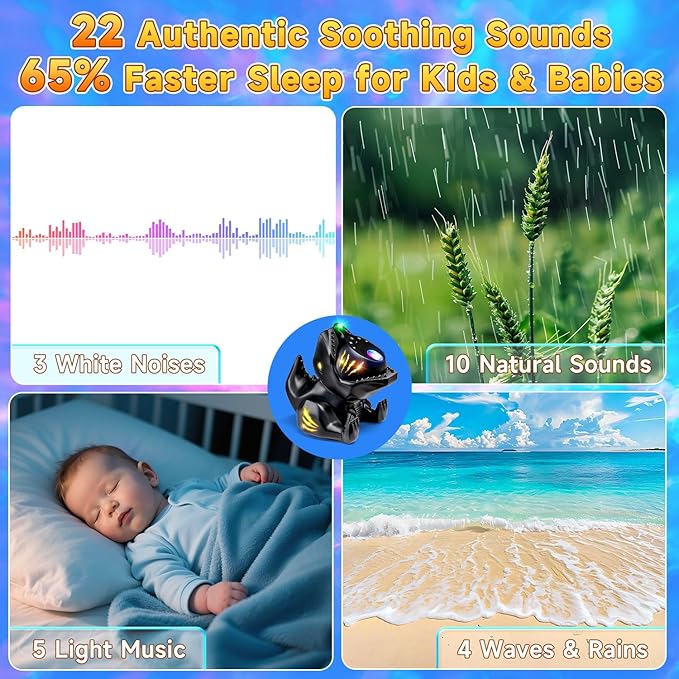 - 22 BUILT-IN WHITE NOISES: DINOSAUR LULL KIDS INTO SLEEP WITHIN 8 MINUTES: The dinosaur galaxy projector features 22 white noise & soothing sounds,all designed & selected for help sleeping & relaxation.With rotating galaxy light & star lights, with soft music, kids not afraid of darkness any more!Dinosaur galaxy projector for bedroom kids projector is eye-catching, with soothing tunes lull kids into sleep within 8 minutes! Both adults & kids can enjoy a sweet sleep every night with star lights for ceiling & galaxy projector for bedroom kids projector.Dinosaur galaxy projector for bedroom kids projector & dinosaur night light projector not only cool, he can also sing sleeping music for kids!