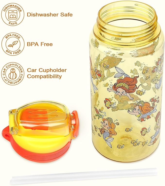 Kids Water Bottle for School or Travel, 20 Oz 2 Pack Durable Plastic Water Bottle with Silicone Straw and Pop-Up Spout Cover, BPA Free & Dishwasher Safe(Mermaid & Princess)