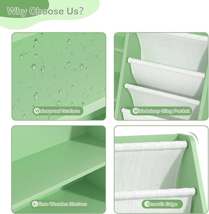 - Kids Bookshelf for Versatile Rooms: This sling bookshelf for kids is suitable for nursery, playroom, bedroom, classroom, kindergarten, living room, reading room, church, homeschooling, school etc. This children bookshelf will help your little one to keep good habit of organizing and cleaning up their room independently. You do not need to be tired of a messy room around with messy books and toys.
