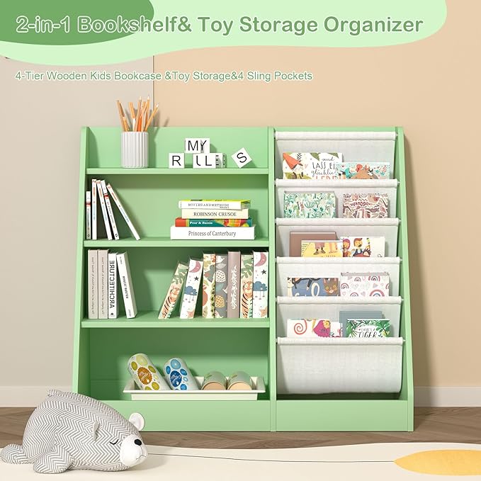 Kids Bookshelf Toddler Bookcase Children Book Rack Baby Toy Storage Organizer Child Book Display Shelf 4-Tier 5 Layer Sling Cabinet Chest Playroom Bedroom Classroom Library Green