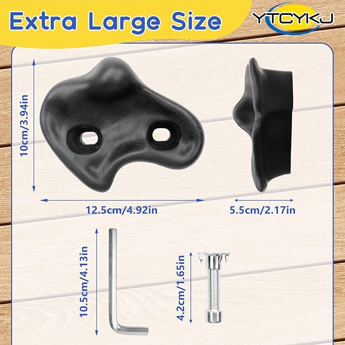 - ใExtra Large Sizeใ3.94"ร4.92", kids climbing holds are larger than most in the market, attach these rock climbing holds to any outdoor playset or onto a sturdy board. Popular outside toy for kids ages 3 years old & up