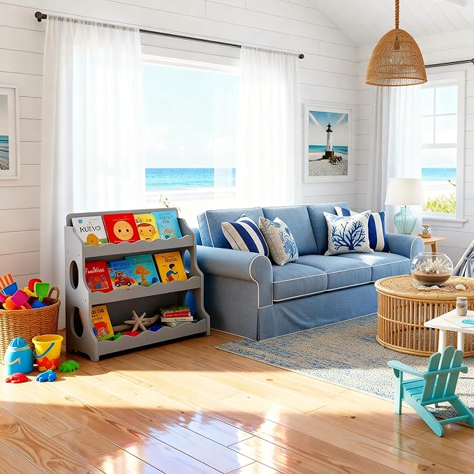 Kids Bookshelf Wooden Montessori Book Shelf Dutch Design 3Tier Scalloped,TranquilGrey