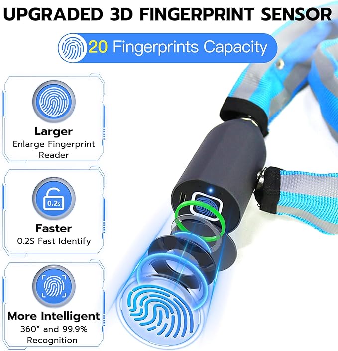 - 🔐【FINGERPRINT UNLOCK】: Fingerprint chain lock uses advanced biometric technology, touch your finger to fingerprint unlock within 0.2 seconds, the unlocking speed is much faster than ordinary rope locks and key locks. Your finger is the key, no longer worry about losing the key or forgetting the password.