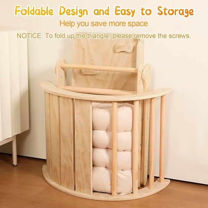 Pikler Triangle Set with Cushion, 7 in 1 Toddler Climbing Toys Indoor, Montessori Foldable Climbing Set, Wooden Climbing Toys for Toddlers Inside with Ramp, Arch and Ladder (Nature Wood)