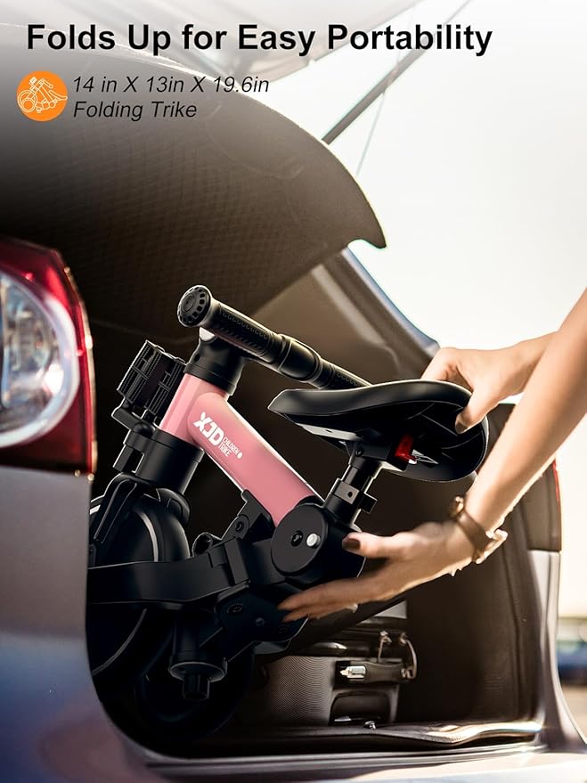 - ONE-TOUCH FOLDING FUNCTION: One button folding opens the tricycle body and folds it into a compact size for easy transportation and storage with the push of a button. Compared with other tricycles, XJD tricycle has extra handlebar seat lift function, one button folding function