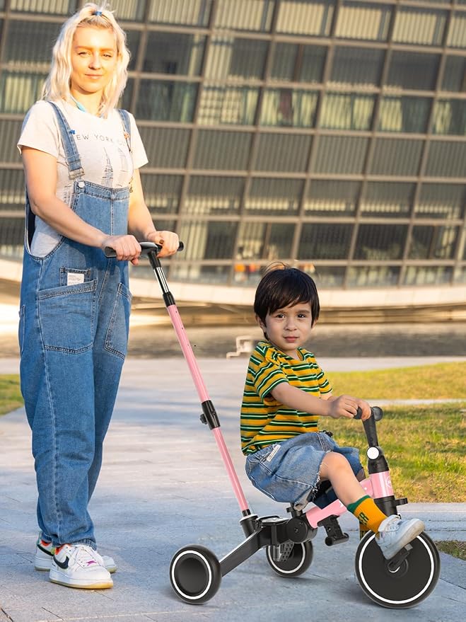 XJD Toddler Bike, 6 in 1 Folding Toddler Tricycle for 1-4 Year Old with Parental Control Handle, Balance Bike with Removable Pedal, Backrest, Adjustable Seat and Handle, First Birthday Gifts (Pink)