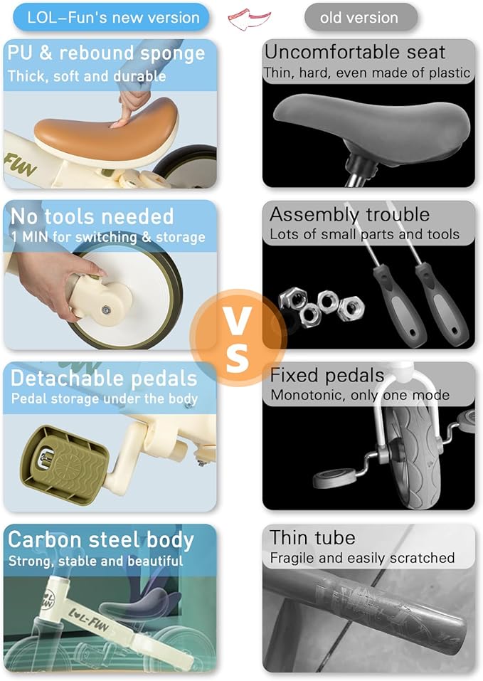 - 4 MODES: Newly mobile toddler wants to move in as many ways as possible. LOL-FUN 4 in 1 balance bike for 1-4 years old boys girls toy, which let kids scoot or roll around, are an ideal first birthday gift on the path to pedal bikes, helping them develop strength, balance, and nerve while they learn how to steer and adjust their speed
