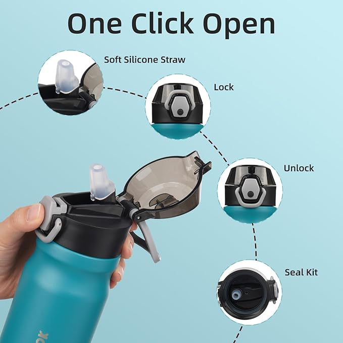 - Leak Proof Locking Lid: Open Your Insulated Water Bottle With The Simple Push Of A Button, Easy For One-Handed Use, The Bottle Has A Protective Cap That Keeps The Drinking Spout Clean, Has A Silicone Locking Latch To Prevent The Lid From Opening