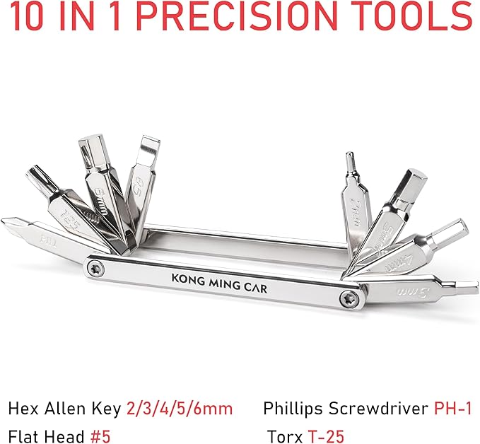 - 【8 IN 1 BIKE MULTITOOL】:Simple folding multitool design made with chrome vanadium steel (CR-V) with polished finish body make the tool durable and fashion, 8 IN 1 tool functions including 2/3/4/5/6 mm Allen / Hex Keys, T25 and Phillip Cross Head Tool #1 screwdriver and Flat head #5, includes most biking fix needs.