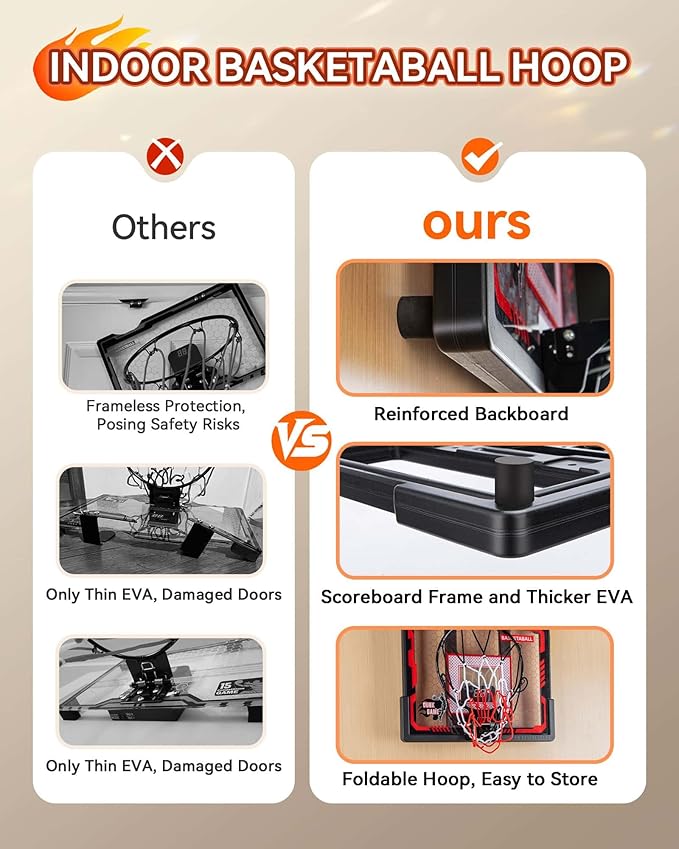 - 【Upgraded Reinforced Frame】Equipped with a sturdy steel rim, a thickened backboard frame, and EVA shock-absorbing strips to prevent door scratches and reduce noise, ensuring stability and durability during sports activities. This design ensures stability and durability during intense sports activities, protecting the hanging door from damage and boosting confidence with every shotPerfect for kids aged 5-12+ years old who love active play.