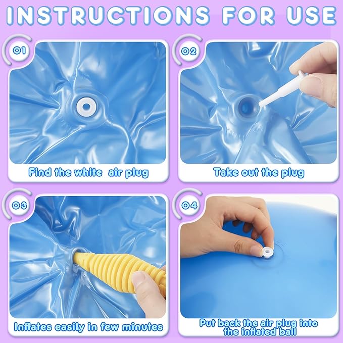 - How to Use: take out the air plug of the exercise ball, insert the tip of the inflation pump to the air hole of the ball, push the inflation pump by hand to inflate the ball to the appropriate size, and then quickly install the air plug back into the hole