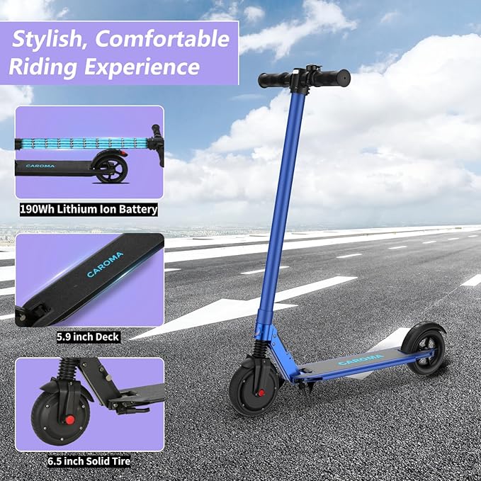 - 🎁Ideal Gift:This Caroma kids electric scooter comes 95% pre-assembled with included toolkit & instructions - ready to ride in 5 minutes.It can be easily folded and unfolded in one step, making it super portable and easy to store.Perfectly packaged for birthdays, graduations,and special celebrations.