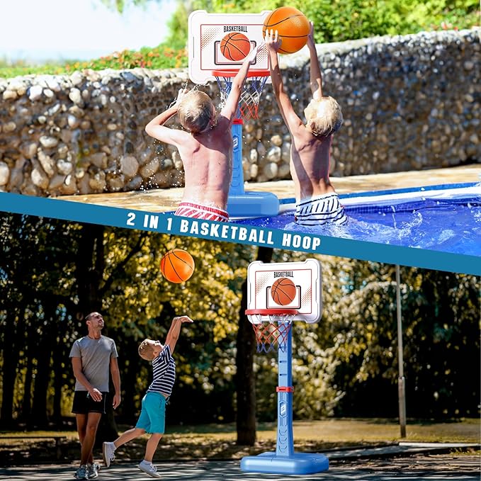 - Easy to Install:This kids basketball goal includes 1 baby basketball hoop, 3 inflatable basketballs, 1 ball pump and all needed assembly parts, you can complete it in minutes according to the instruction and start to play with your children immediatly.The portable basketball hoop is convenuent for kids to enjoy basketball game anywhere, a great outdoor toy and heat game for swimming pool.