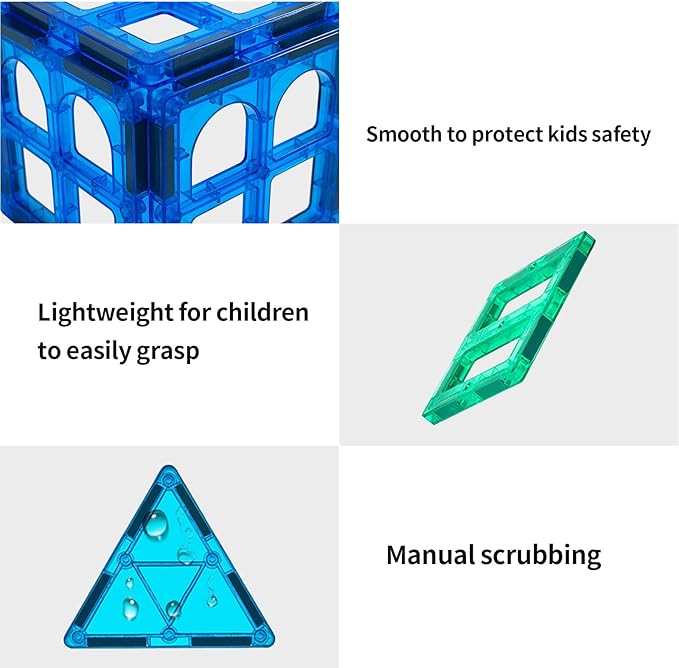 - The magnet tiles set is made of ABS material that safe environmentally friendly, suitable and safe for kids age 3+. The magnetic tiles are designed with rounded edges and won't hurt the children. The magnetic blocks are relatively lightweight and easily pick up the magnet tiles to build flower, butterfly, airplane, castle.