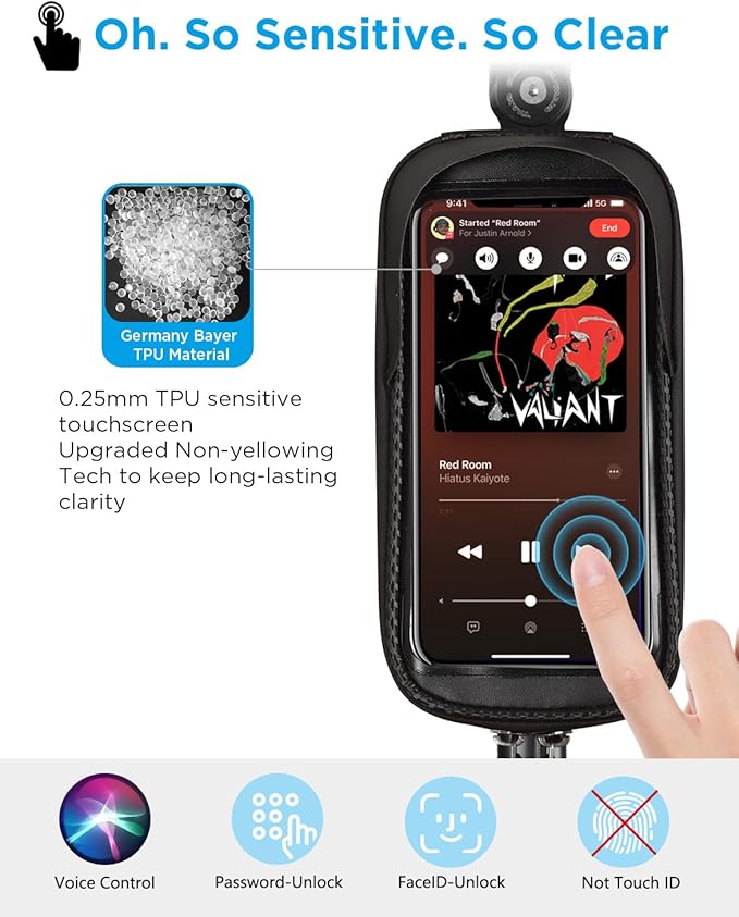 - 【Sensitive Touchscreen & Easy Phone Unlocking】Equipped with a 0.25mm ultra-sensitive TPU screen, it supports Face ID, Voice Control, and Password Unlock—making it easy to operate navigation apps while riding. (Fingerprint unlock not supported)