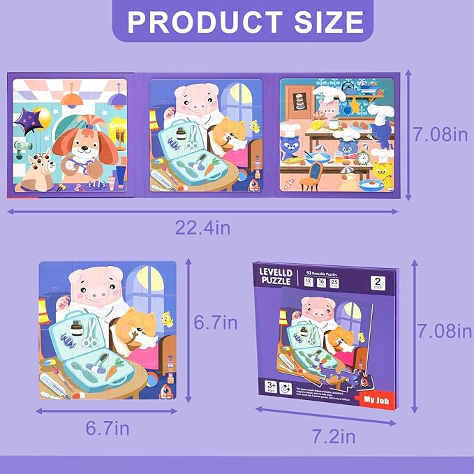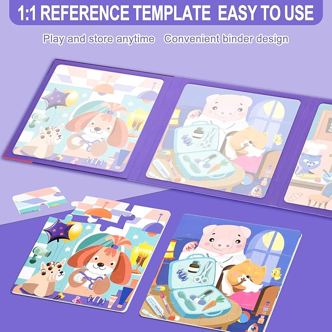 - 🧩[3-IN-1 ANIMAL PUZZLE] Each book has three sides with different illustrations, hairdresser/doctor/chef puzzles, 12-16-25 pieces from easy to difficult, this is a challenging learning activity book that helps develop motor skills and improve logical thinking.