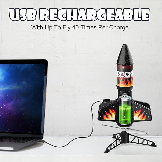 - Rechargeable Rocket: This motorized rocket toy is powered by high quality lithium batteries. Fully charged in 40 minutes, the rocket launcher toy can fly up to 25-40 times, which depend on the heights mode you choose. Saving the cost and trouble of replacing the battery.