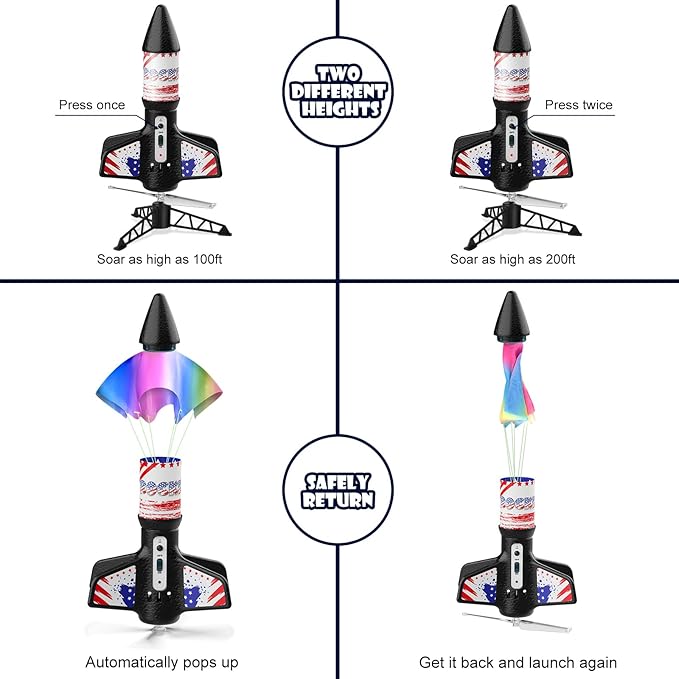 - 2 Height Setting: The rocket launcher has 2 different heights mode by controlling the launch button. Pressing the launch button once will soars up to 100 ft (about 4S flight time), and pressing the launch button twice in a row will launch the rocket to 200 ft (about 8S flight time).