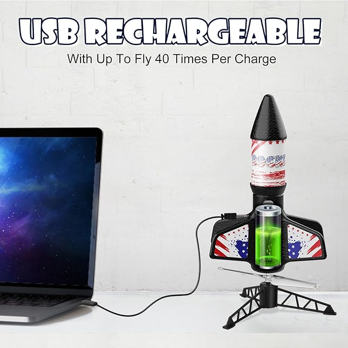 - Rechargeable Rocket: This motorized rocket toy is powered by high quality lithium batteries. Fully charged in 40 minutes, the rocket launcher toy can fly up to 25-40 times, which depend on the heights mode you choose. Saving the cost and trouble of replacing the battery.