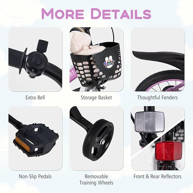 - [ More Child-friendly Design ]: This bicycle is designed with more details for added fun and convenience, such as the extra bell, removable storage basket, and thoughtful fenders. Lovely patterns appeal to kids. Plus, the ergonomic seat offers kids comfortable support. The non-slip pedals provide kids with a safe riding experience.