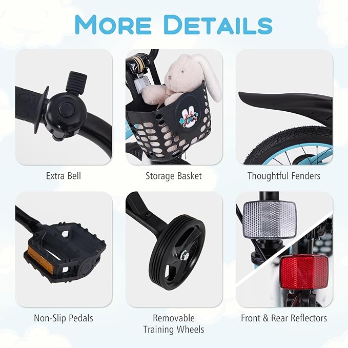 - [ More Child-friendly Design ]: This bicycle is designed with more details for added fun and convenience, such as the extra bell, removable storage basket, and thoughtful fenders. Lovely patterns appeal to kids. Plus, the ergonomic seat offers kids comfortable support. The non-slip pedals provide kids with a safe riding experience.