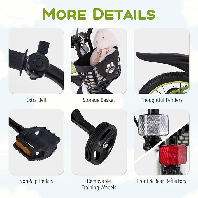 - [ More Child-friendly Design ]: This bicycle is designed with more details for added fun and convenience, such as the extra bell, removable storage basket, and thoughtful fenders. Lovely patterns appeal to kids. Plus, the ergonomic seat offers kids comfortable support. The non-slip pedals provide kids with a safe riding experience.
