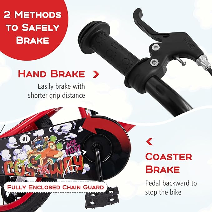 - [ Dual Brakes for Safe Riding ]: The kids bike comes with 2 methods to safely brake. The hand brake helps your child easily brake with shorter grip distance, while the coaster brake enables kids to pedal backward to stop the bike. What’s more, the fully enclosed chain guard protects kid’s feet from getting pinched for higher safety.