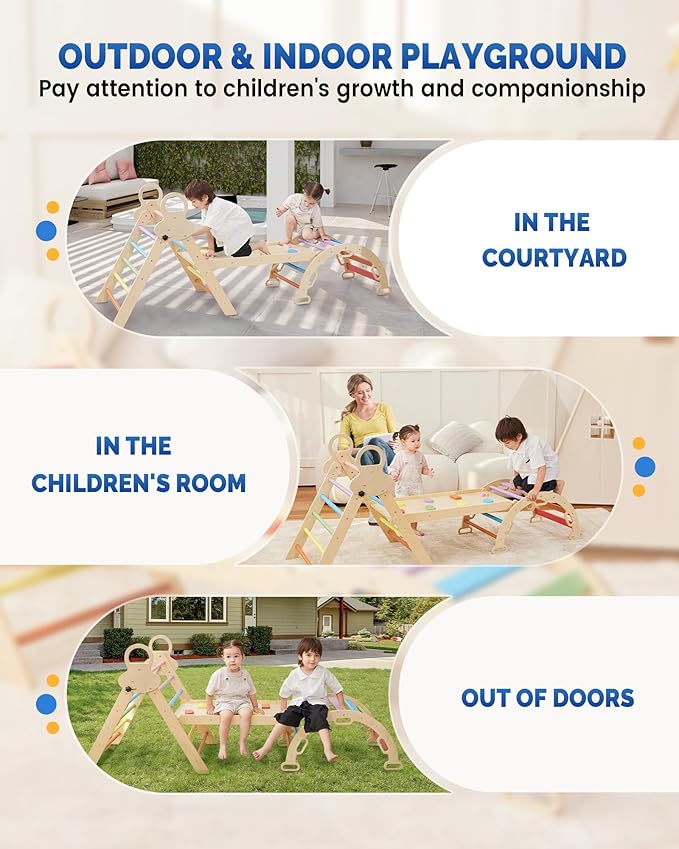- Crafted from Premium Wood: Pikler Triangle Set is made from natural wood with a load capacity of 190 lbs (86 kg). Suitable for kids aged 1-6, it adds warmth and color to any space. The toddler climbing toys indoor with a rainbow design enhances color recognition. Hand-polished finishes make it easy to clean, and maintain. Pikler triangle climbing set is perfect for indoor playset for toddlers 1-3, encouraging creativity and active fun.