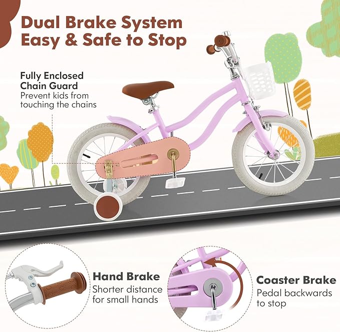 - 【Dual Brake System & 4-step Installation:】The kids' bicycle is designed with both a hand brake and a coaster brake, ensuring quick and safe stops. Additionally, it features a fully enclosed chain guard to keep children's hands away from the chains. This bike arrives 95% pre-assembled, with no brake installation required. Simply follow these four installation steps: First, attach the handlebar. Second, secure the basket. Third, affix the pedals. Fourth, attach the removable training wheels.