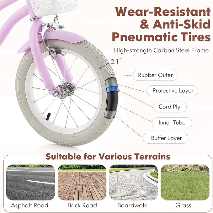 - 【Durable Construction】 The toddler bike features robust pneumatic tires with a 5-layer design that is both wear-resistant and anti-skid, providing stability and safety on diverse terrains. Furthermore, the bike is reinforced by a high-strength carbon steel frame, guaranteeing lasting enjoyment and requiring minimal maintenance.