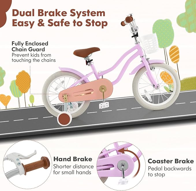 - 【Dual Brake System & 4-step Installation:】The kids' bicycle is designed with both a hand brake and a coaster brake, ensuring quick and safe stops. Additionally, it features a fully enclosed chain guard to keep children's hands away from the chains. This bike arrives 95% pre-assembled, with no brake installation required. Simply follow these four installation steps: First, attach the handlebar. Second, secure the basket. Third, affix the pedals. Fourth, attach the removable training wheels.