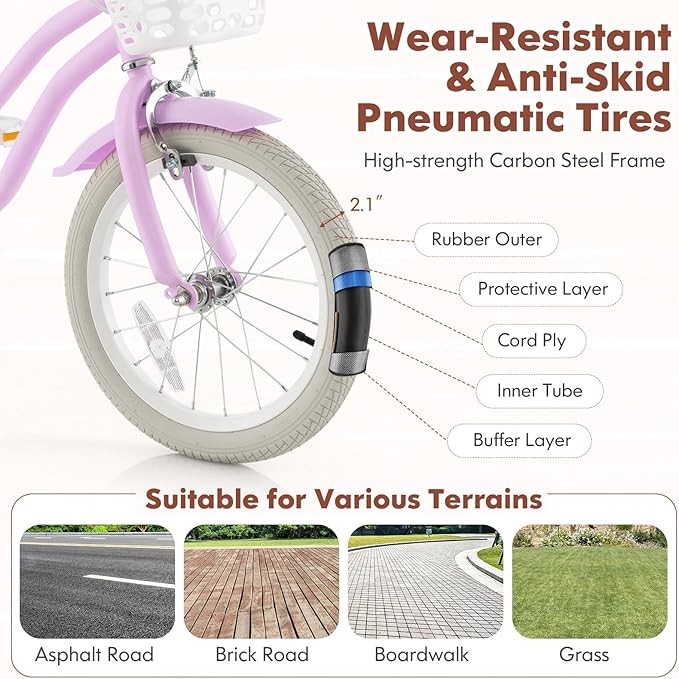 - 【Durable Construction】 The toddler bike features robust pneumatic tires with a 5-layer design that is both wear-resistant and anti-skid, providing stability and safety on diverse terrains. Furthermore, the bike is reinforced by a high-strength carbon steel frame, guaranteeing lasting enjoyment and requiring minimal maintenance.