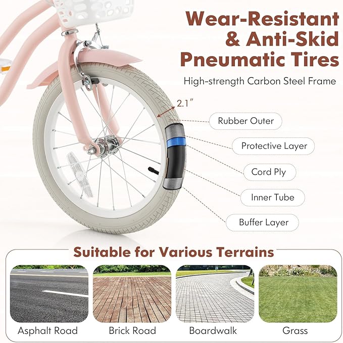 - 【Durable Construction】 The toddler bike features robust pneumatic tires with a 5-layer design that is both wear-resistant and anti-skid, providing stability and safety on diverse terrains. Furthermore, the bike is reinforced by a high-strength carbon steel frame, guaranteeing lasting enjoyment and requiring minimal maintenance.
