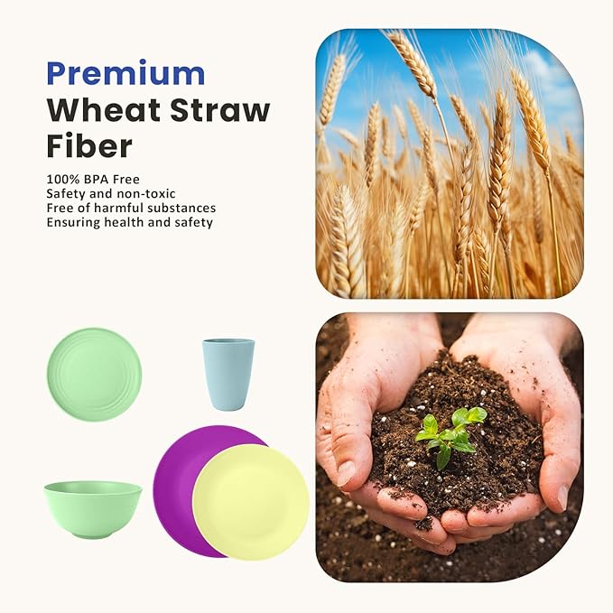 - PERFECT COMBINATION: In the busy daily life, looking for tranquility and nature, we bring you a set of wheat straw dinnerware sets, 10" dinner plates(8), 9" dessert plates(8), 6" kids plates(8), 26 oz cereal bowls(8) and 12 oz drinking glasses(8). Whether it is daily family gatherings, exquisite restaurants, or picnics during outdoor camping, tranquility on RVs. It can be perfectly integrated into various occasions, adding a touch of nature and elegance to your life